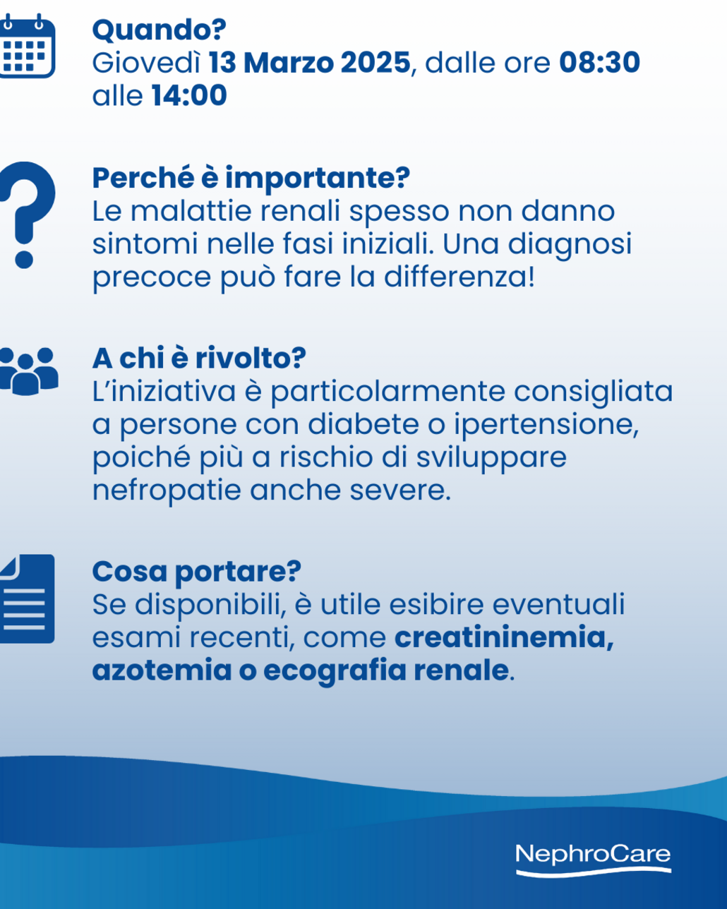 Noi di NephroCare sosteniamo pienamente questa iniziativa, perché crediamo che la prevenzione sia il primo passo per una vita più sana. Molte malattie renali sono silenziose e vengono scoperte troppo tardi. Prenditi cura dei tuoi reni con uno screening gratuito.
