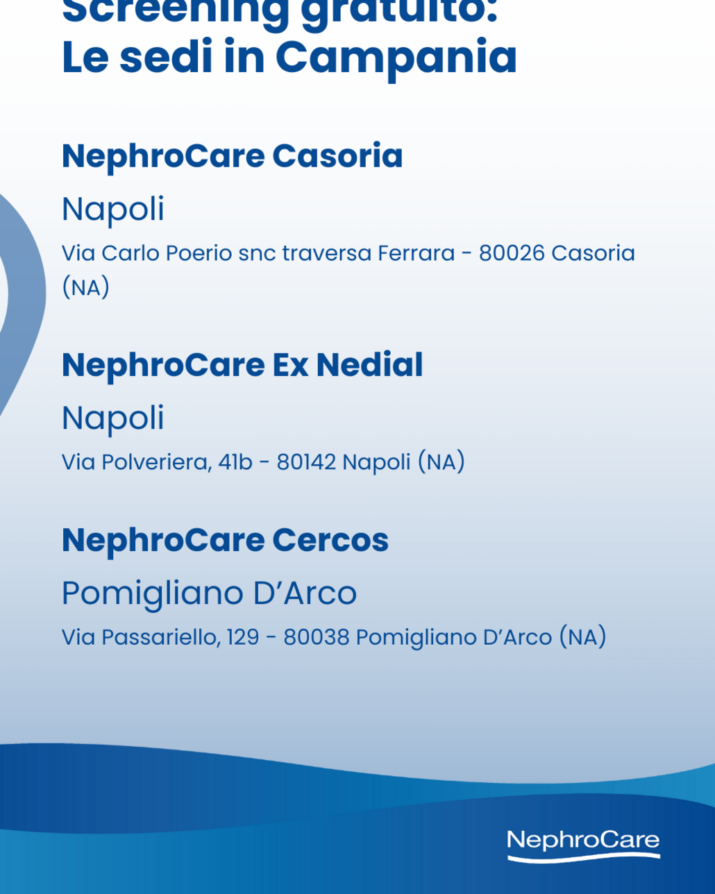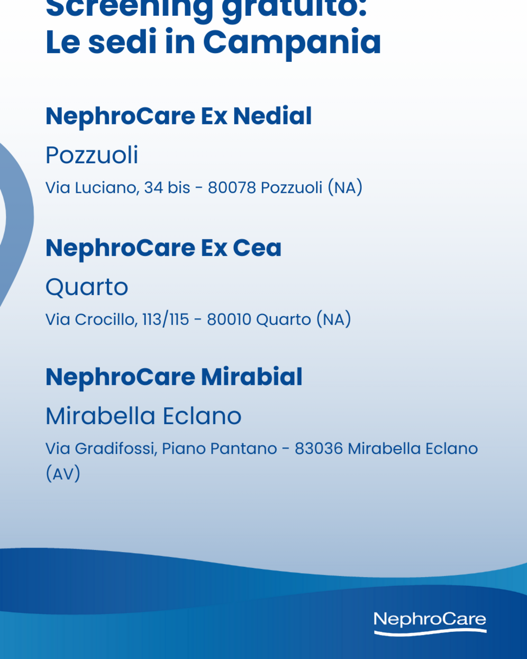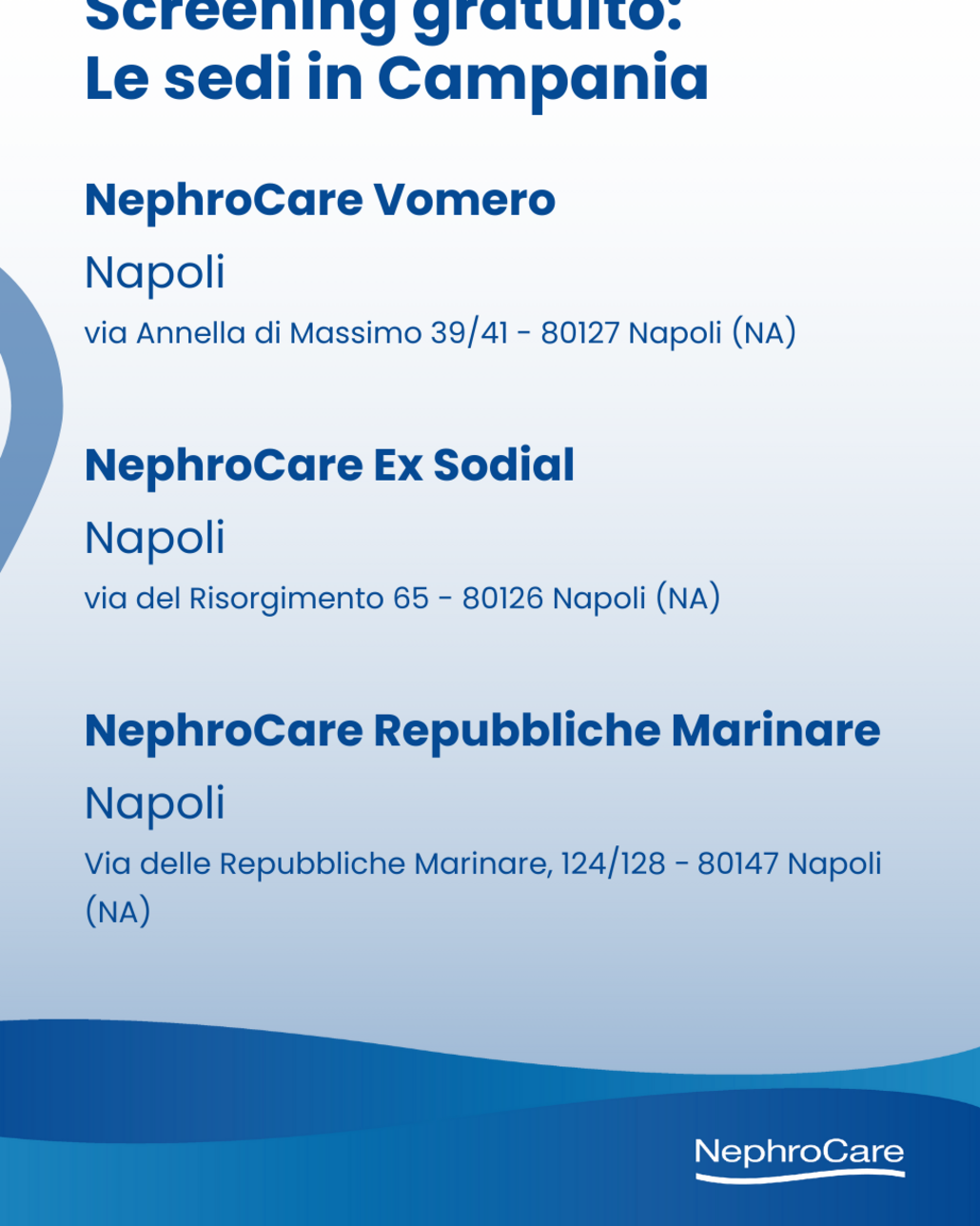In occasione della Giornata Mondiale del Rene, che si terrà il 13 marzo 2025, gli ambulatori NephroCare in Campania organizzano una giornata di Screening gratuito dalle ore 8.30 alle 14.00.