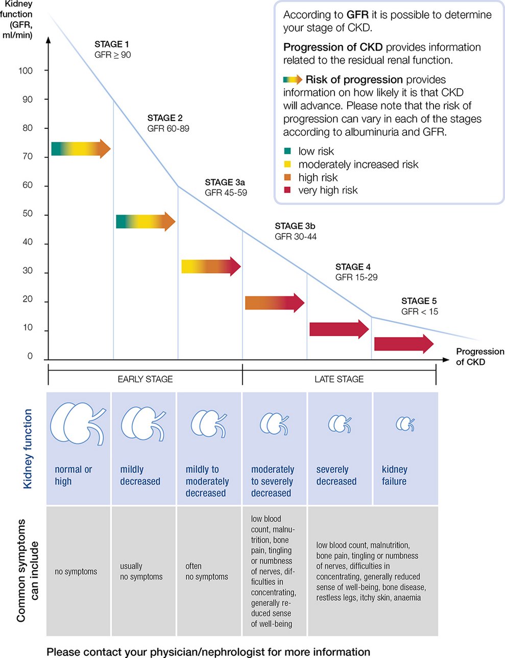 Brzina glomerularne filtracije (GFR) je mera funkcije bubrega koja se može proceniti jednostavnim testom krvi koji meri nivo kreatinina i albumina u krvi, uzimajući u obzir i vaše godine, rasu, pol i ostale faktore. Pomoću GFR-a vaš lekar može da odredi fazu bolesti bubrega i isplanira lečenje. Što je niža GFR, to je rizik od napredovanja bolesti veći. Rizik od napredovanja pruža informacije o tome koliko je verovatno da će HBI napredovati.